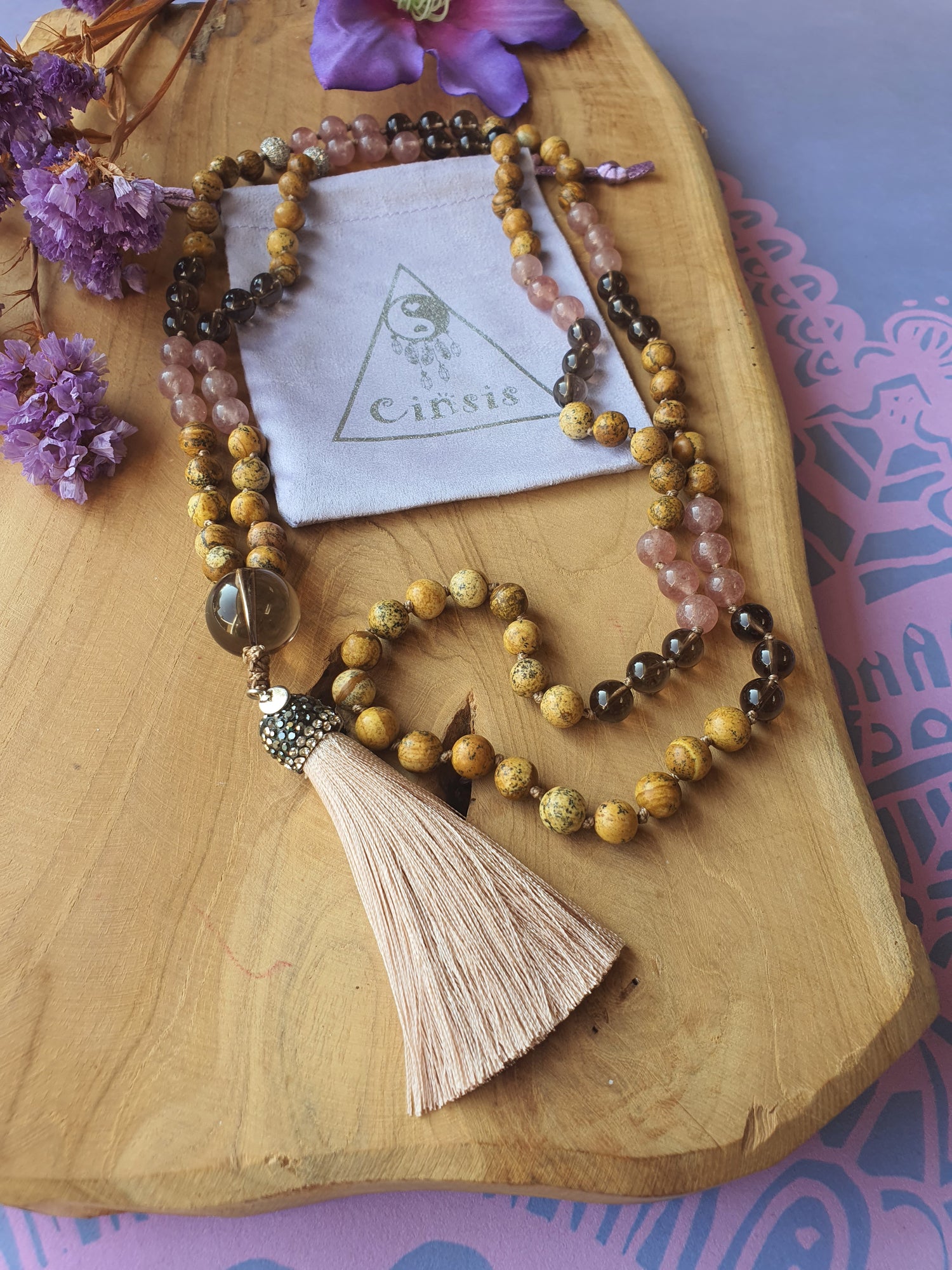 Edelsteen of Rudraksha Mala’s, edelsteen mala's met een moderne twist. De mala's van Cinsis zijn persoonlijk door de eigenaresse handgemaakt met de mooiste edelsteen- en /of Rudraksha kralen. Wij geloven dat de keuze voor de juiste (edelsteen) kralen bijdraagt aan de kracht en intentie van iedere mala. Elke edelsteen heeft namelijk zijn eigen specifieke energie en helende eigenschappen. Bij Cinsis Edelsteen Mala hebben we echter een moderne twist gegeven aan onze creaties. Niet alle edelsteen mala zijn gemaakt met een traditioneel kwastje eraan bevestigd. In plaats daarvan heb ik ervoor gekozen om onze mala’s ook te combineren met een edelsteen en /of een orgonite hanger, waardoor ze niet alleen esthetisch aantrekkelijk, maar ook energetisch versterkt worden.