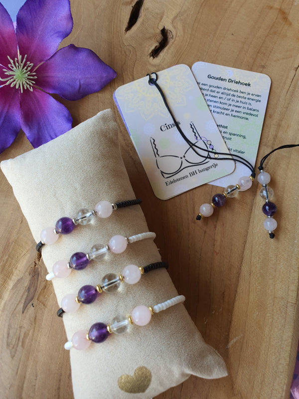 Deze edelstenen Armband bevat een gouden driehoek: Amethist, Bergkristal en Rozenkwarts. Je krijgt een bijhorend kaartje met uitleg over de edelstenen. Het kaartje is een visitekaartje formaat, fijn om mee te nemen!