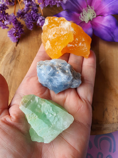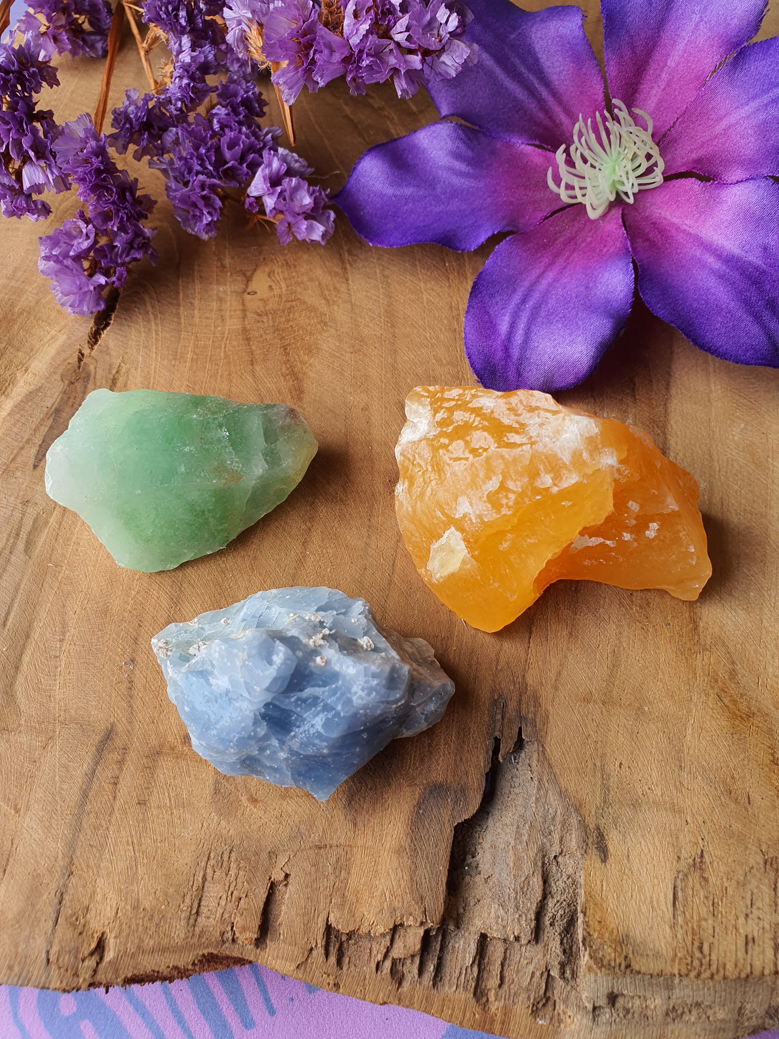 Chakra: blauwe calciet werkt in op het keel chakra (5e), groene calciet op het hart chakra (4e), oranje calciet op het heiligbeen chakra (2e).