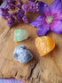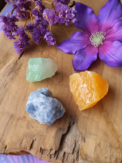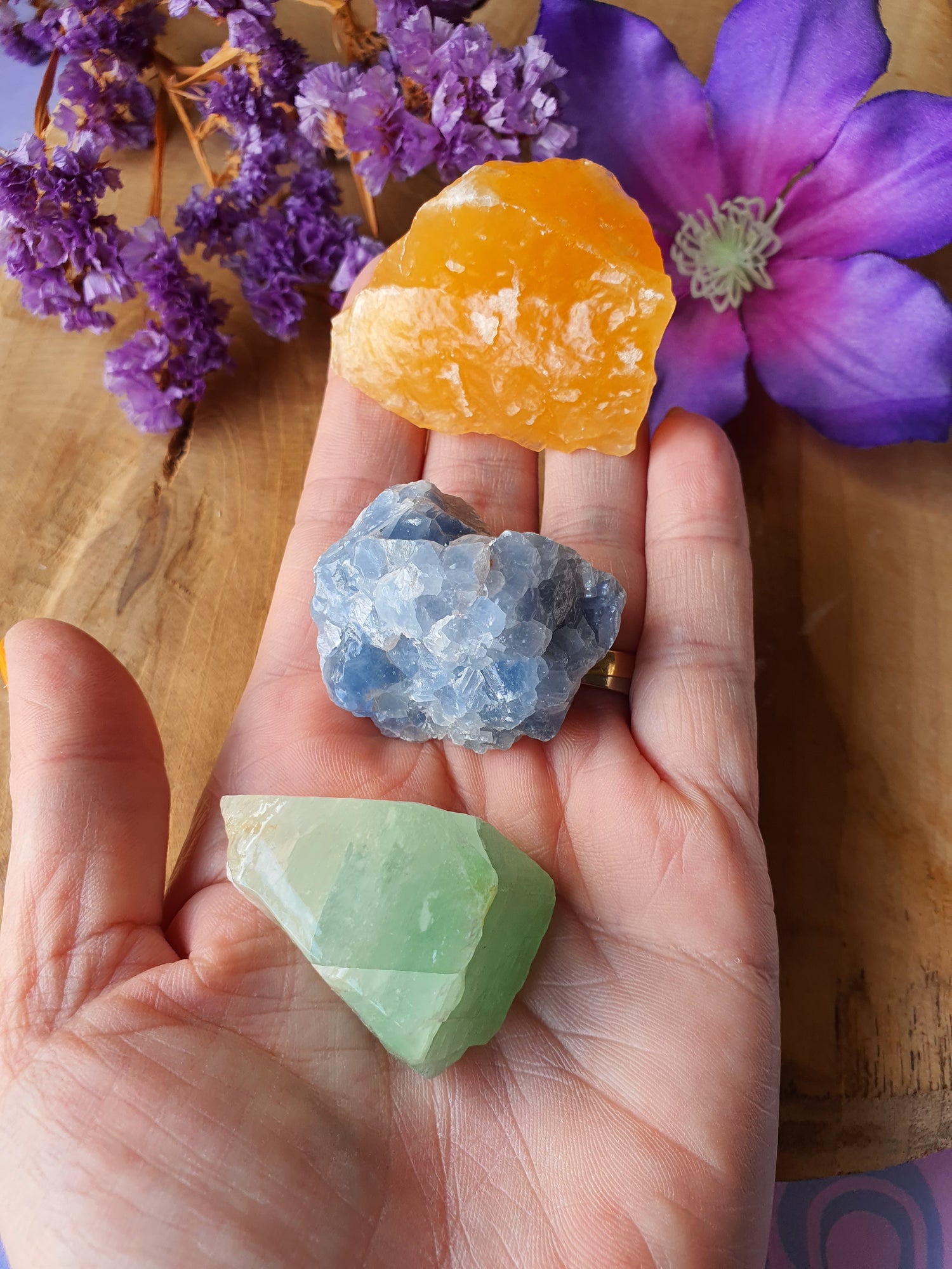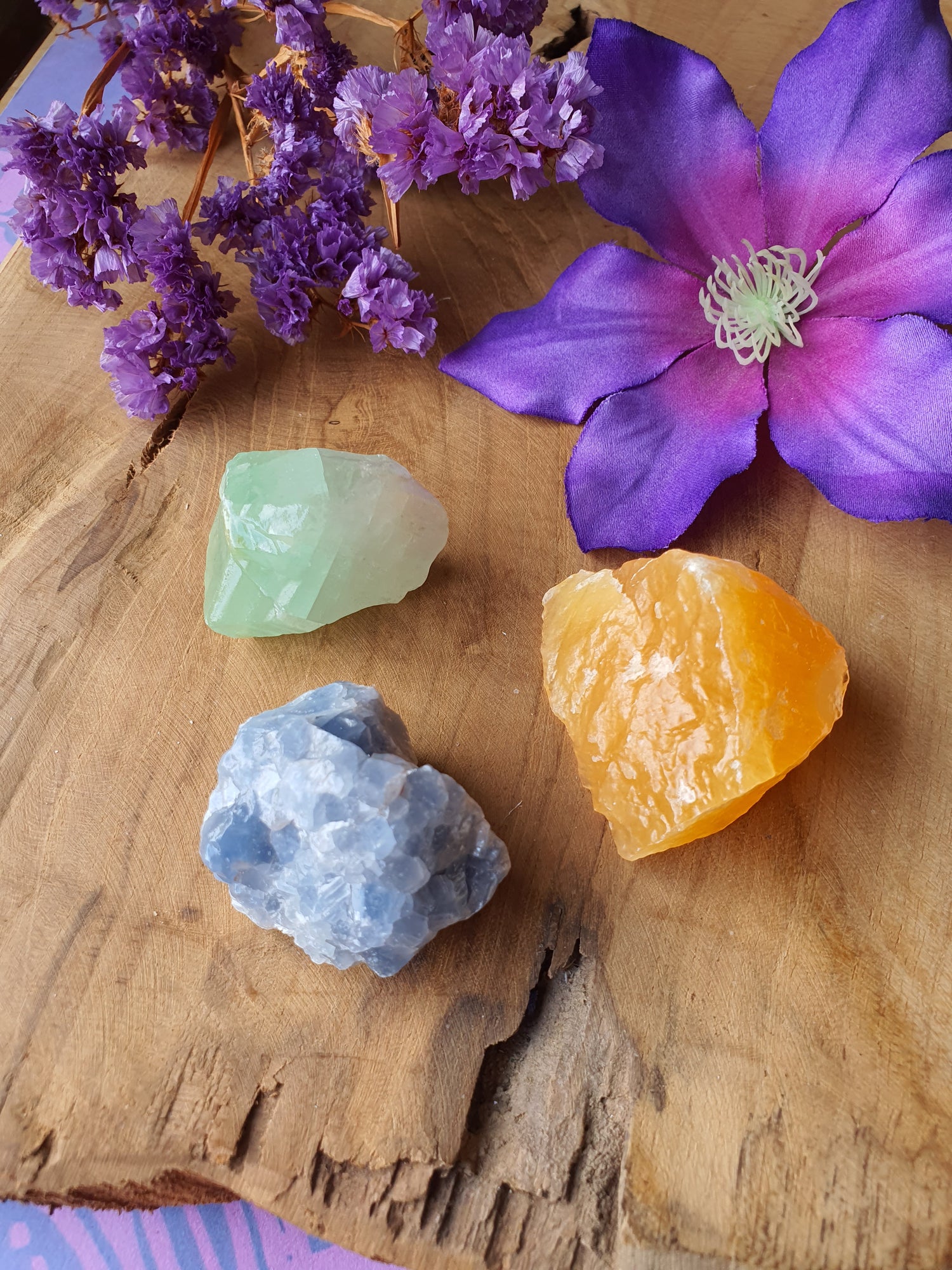 Chakra: blauwe calciet werkt in op het keel chakra (5e), groene calciet op het hart chakra (4e), oranje calciet op het heiligbeen chakra (2e).