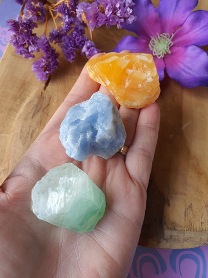 Chakra: blauwe calciet werkt in op het keel chakra (5e), groene calciet op het hart chakra (4e), oranje calciet op het heiligbeen chakra (2e).
